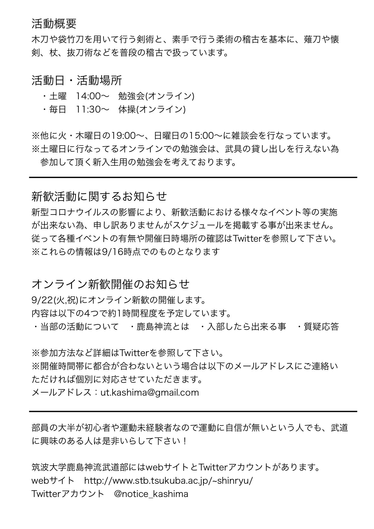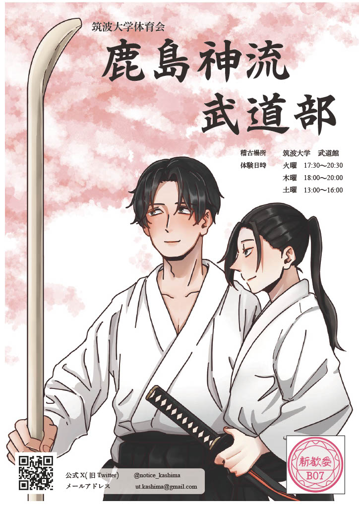 鹿島神流武道連盟 の筑波大学支部に所属する学生部が課外活動団体として筑波大学体育会に所属しています。