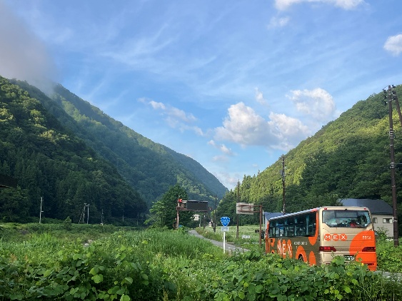 5 時前になると2台のバスがやってきた。バスのトランクに大きな”荷物”を入れ、バスに乗り込む。「途中で降りたい方は場所を教えてください。ルート上ならどこでも可能ですので」このように運転手さんが言ってくれたので、「内川」を指定してみた。本来の最初のバス停留所「駒ケ岳登山口」から20km手前の位置である。事前に問い合わせたところ、「指定停留所以外では下車できない」とのことだったのでダメもとである。ところが、親切にも会津バスの運転手さんは受け入れてくださり、5時40分ごろ「内川」で下車した。