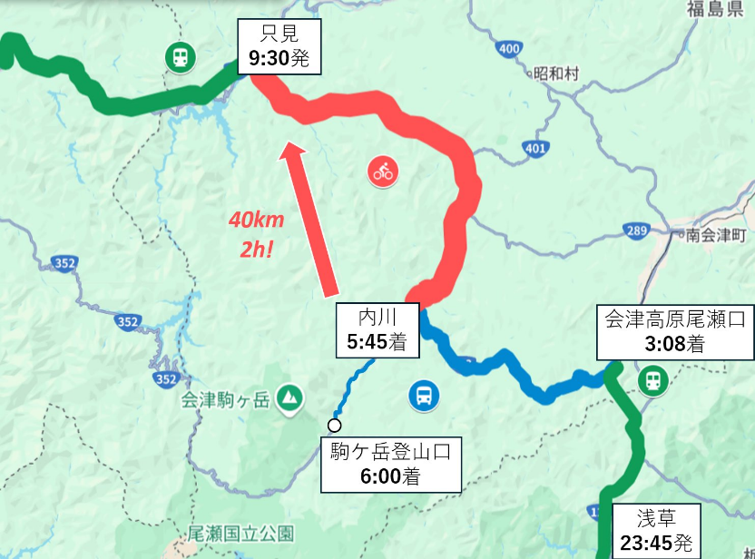※輪行:自転車を専用の袋に収納し、公共交通機関を使って運搬・移動すること。今回、尾瀬夜行23:45で輪行という前例はなかったので、東武トップツアーズに事前確認を行ったうえで実施している。