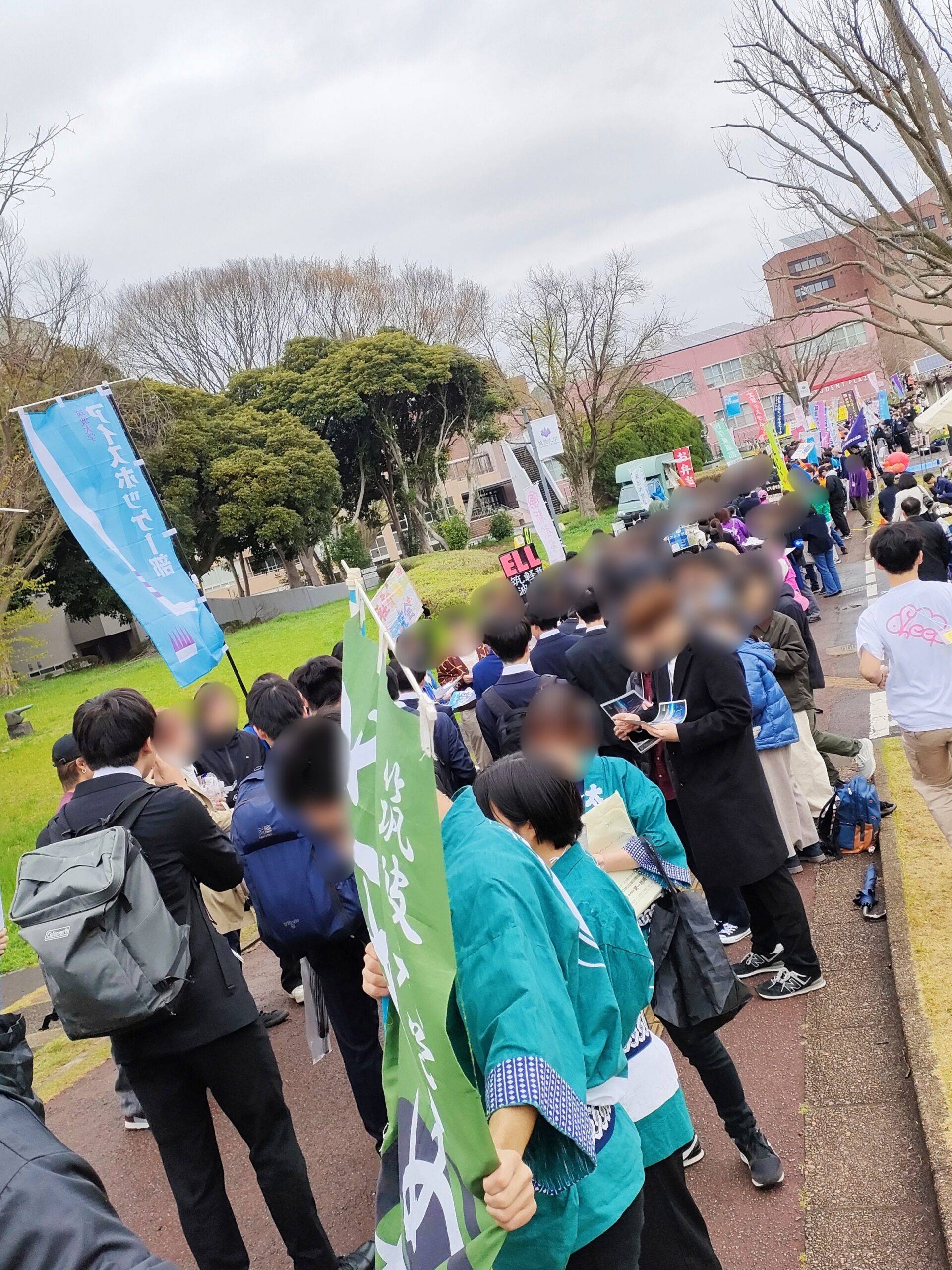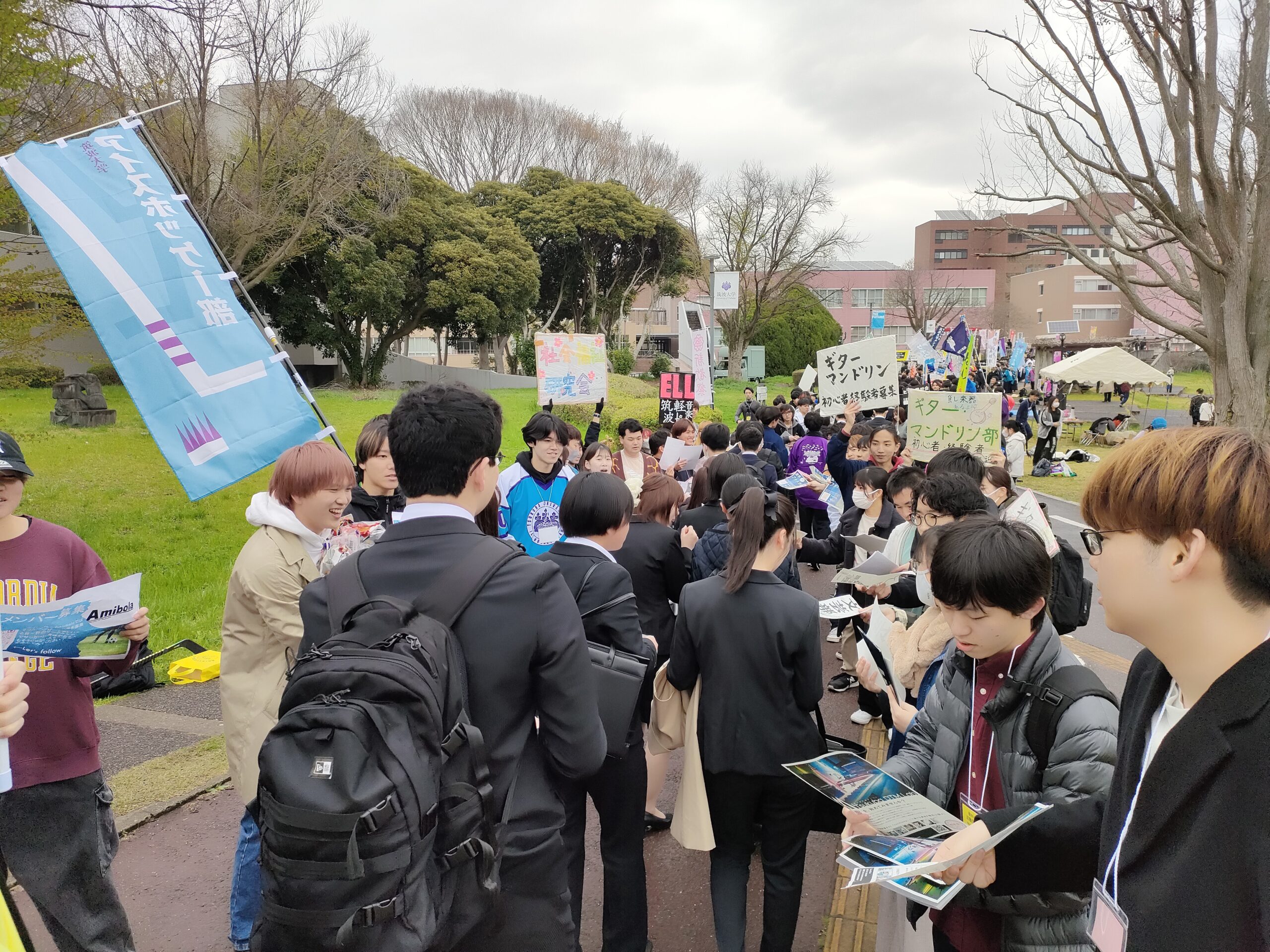 花道では学生団体(いわゆるサークル)の先輩たちがビラ配りを行っています。少し先輩たちの気迫に驚くかもしれませんが、新入生の入学を祝う気持ちです。
