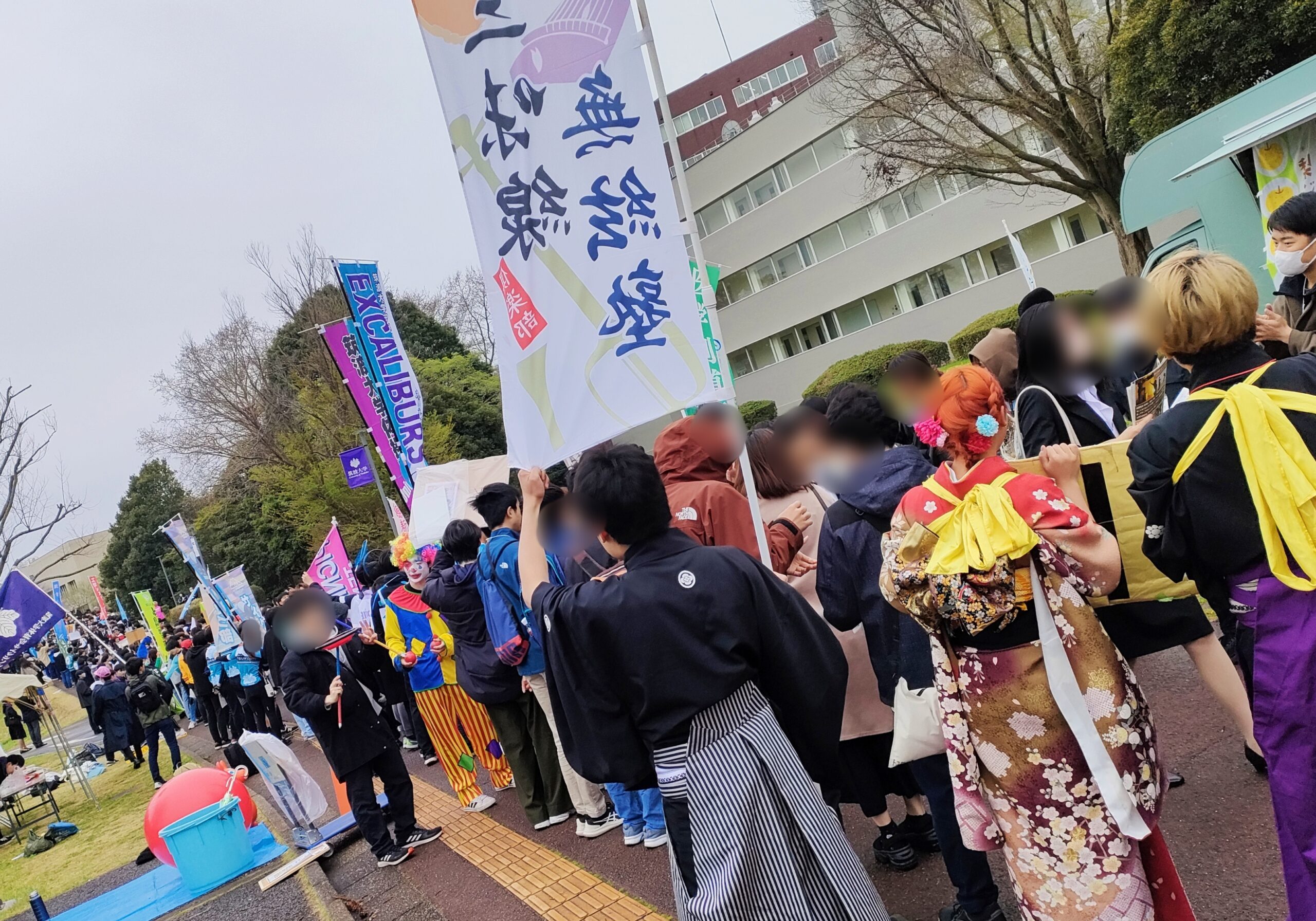 このエリアでは、入学式式場ではバラバラだった同じ学類の仲間たちと待ち合わせ、同じ旗の下に集います。