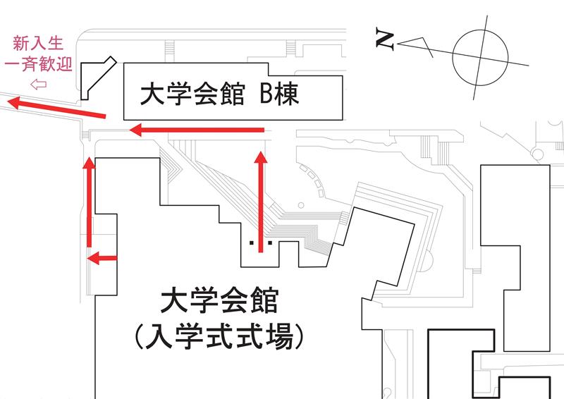 入学式閉式後、大学会館(入学式式場)から出たのち、上の地図に従って会場へお越しください。 会場へ向かう橋を越えると、学類の先輩が旗を掲げたり法被を着たりしながら新入生の皆さんを待っています。自分の学類の場所までお集まりください。 保護者の方の、橋より北側の新入生一斉歓迎会場への立ち入りはご遠慮いただいております。新入生のスムーズな移動のため、ご理解とご協力の程よろしくお願いいたします。