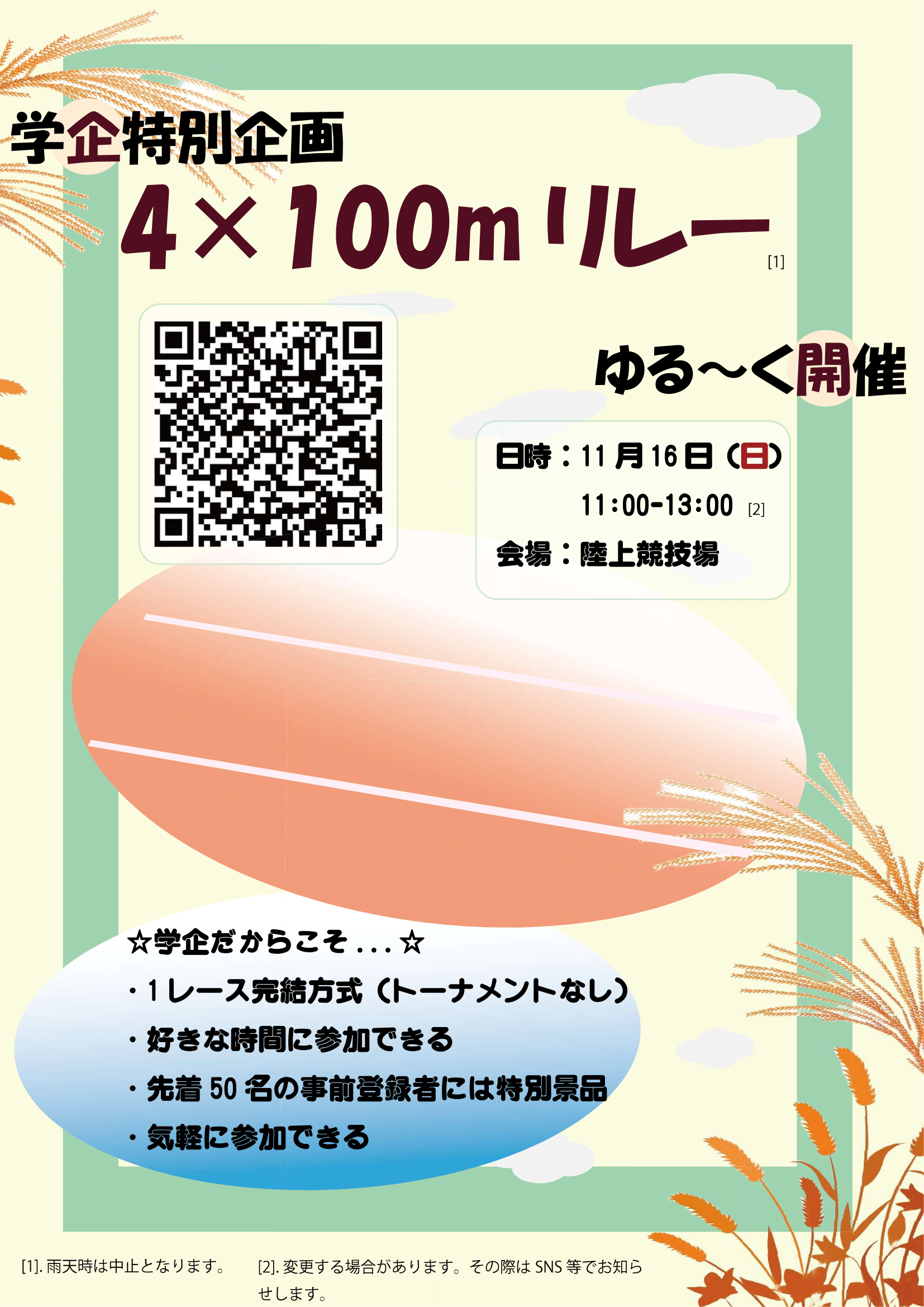 スポデー2日目に学生委員会企画にて「4×100mリレー」を行います! ハンデルールの設定やバトンパスの簡素化、当企画限定の参加賞など、 誰でも気軽に楽しく参加できる企画になっています! 皆さんのご参加お待ちしています!
